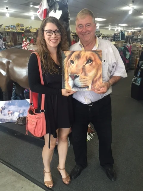 A few months ago I was painting at the Modjeska Canyon Art and Wine Fundraiser, when a guy named Jim walked up and began showing me photos of his gorgeous dog. We had a pleasant conversation, he walked off, and I re-immersed myself in my painting. Suddenly, he returned and asked if I could paint a lion, to which I replied, "heck yes"! If you know me, you know I love cats- and the Texas in me believes that bigger is always better. Jim had a vision of a lion with a baby reflected in one eye and a camel in the other; a metaphor for someone's spiritual walk with God. So I teamed up with him to bring it to life!