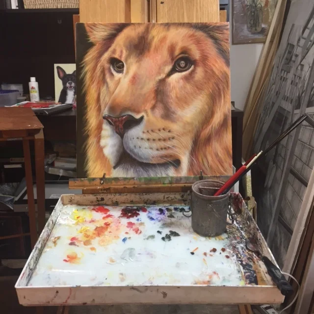 This painting is oil on Belgian linen, and I loved the surface so much that I've decided to do all future commissions on the same type of canvas. It really helps get a lot of detail into a small area- perfect for painting the individual lion hairs with a small liner brush, and the paint flows across the smooth surface quite smoothly.