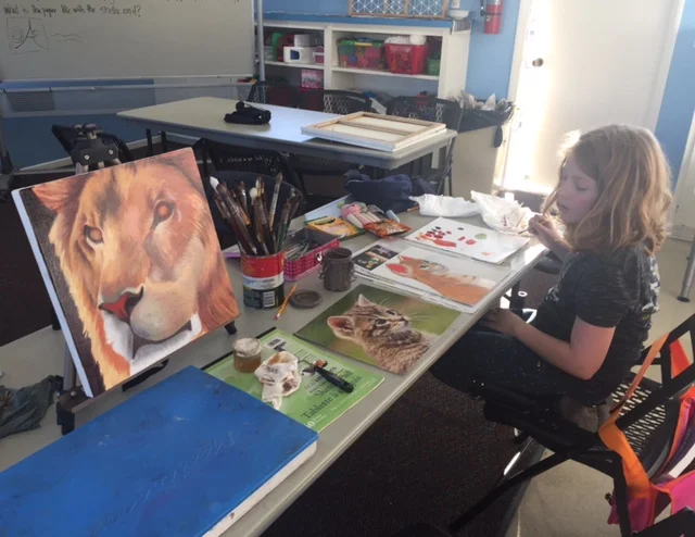 This piece was unique because I worked on it in a number of settings. I enjoy getting out of the studio and painting around people, nature, and life, because it infuses energy into my artwork. I used the lion as a class demo for my young students at Terra Arts, took it up into the mountains for a few days to paint near a stream, and worked on it during a few artwalks.